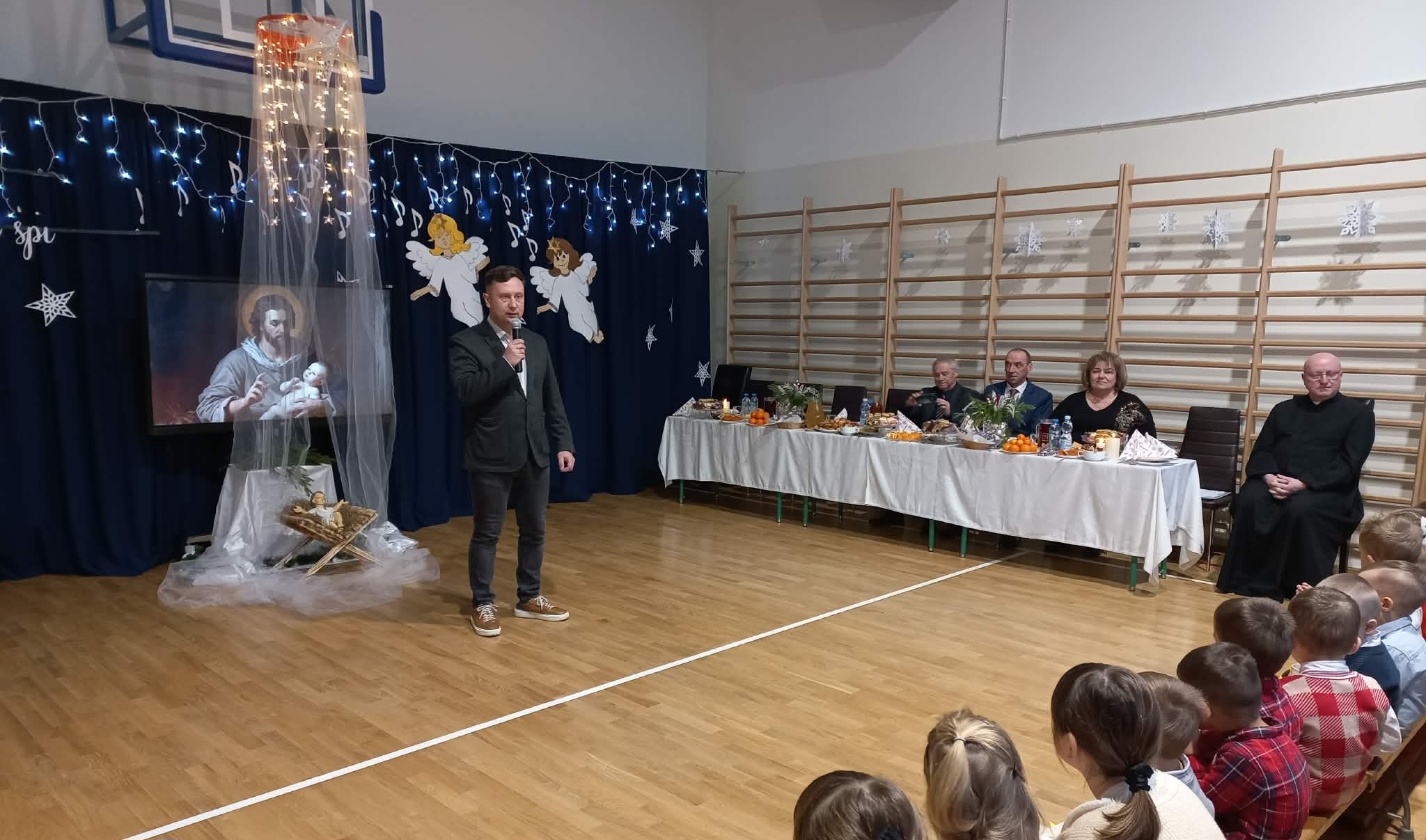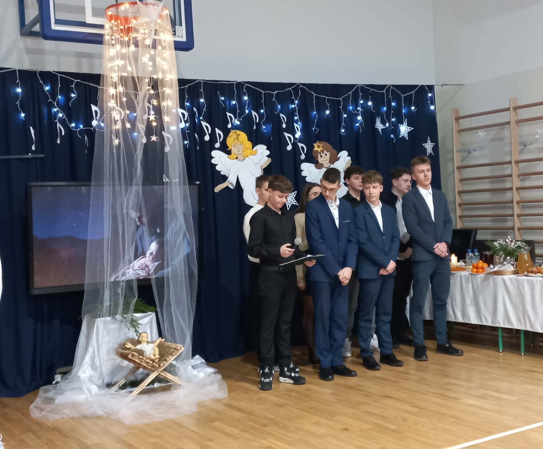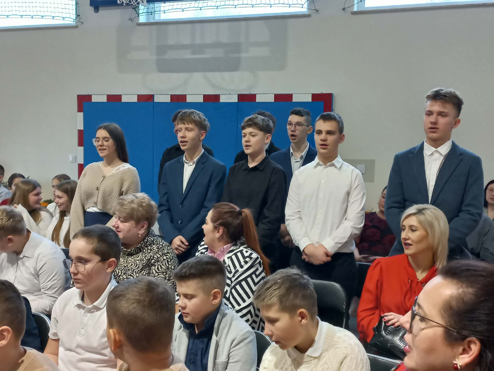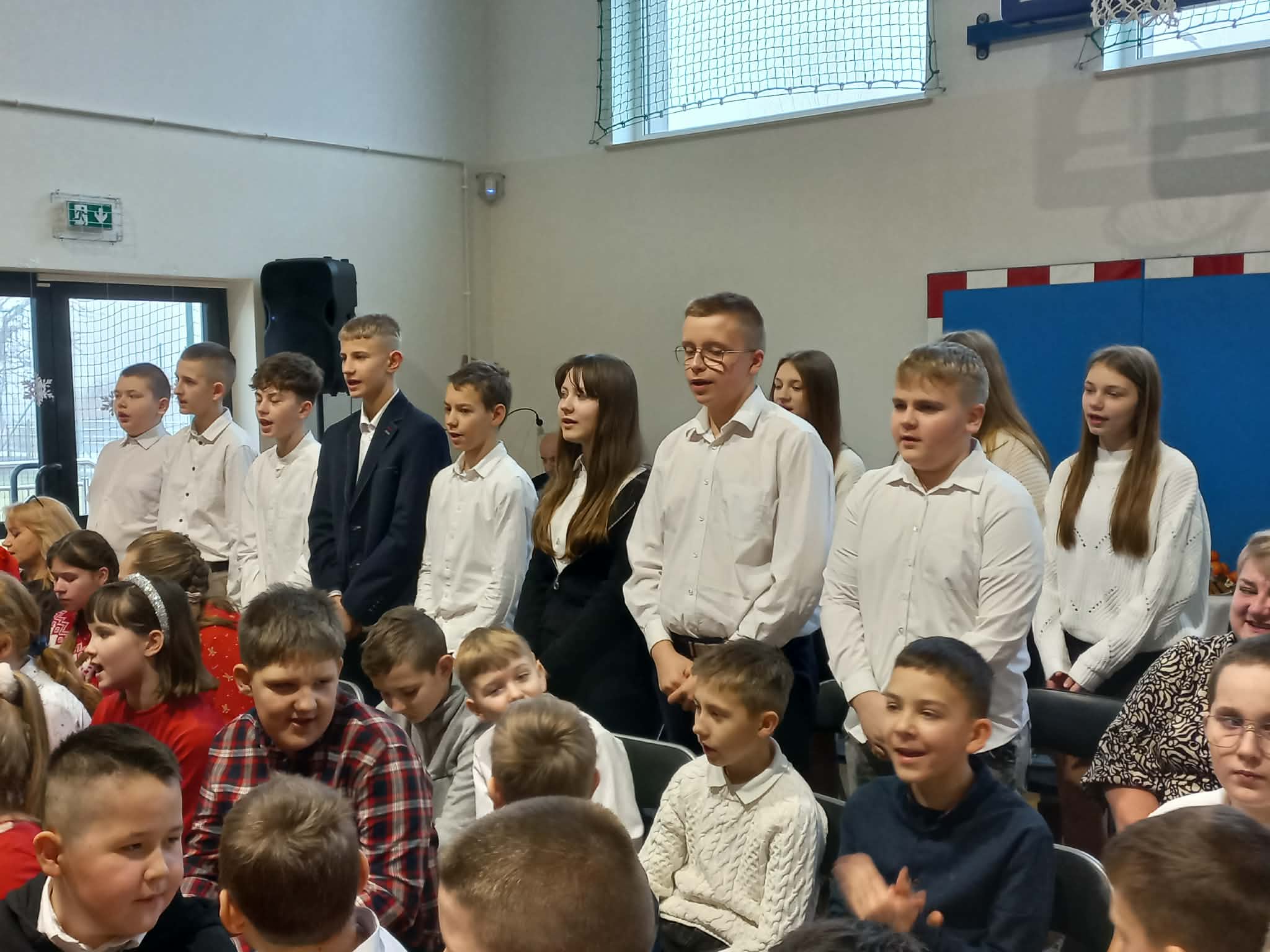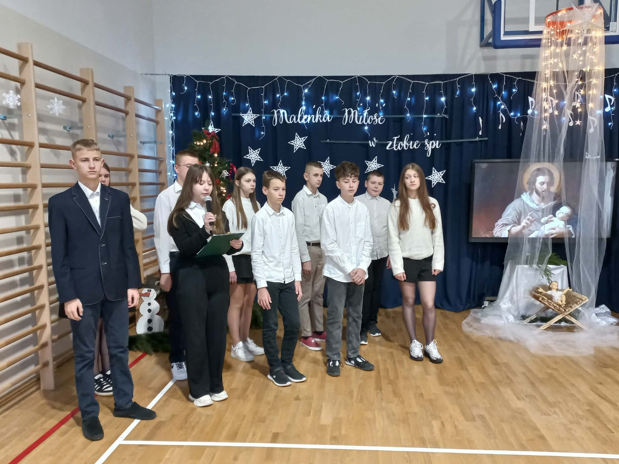 Centralnym punktem uroczystości było wspólne kolędowanie, w które zaangażowali się uczniowie wszystkich klas. Dzieci i młodzież z radością wykonywały tradycyjne polskie kolędy i pastorałki, tworząc niezwykle nastrojową i wzruszającą atmosferę. Wspólny śpiew stał się symbolem jedności, radości oraz pielęgnowania bożonarodzeniowych tradycji.