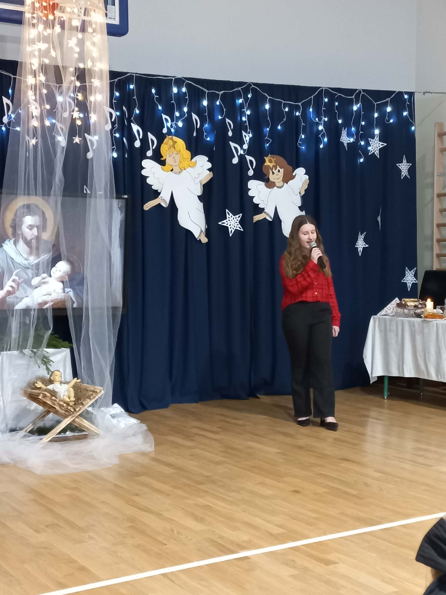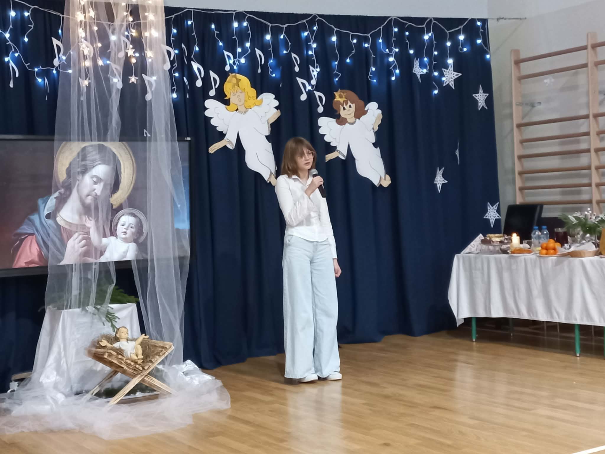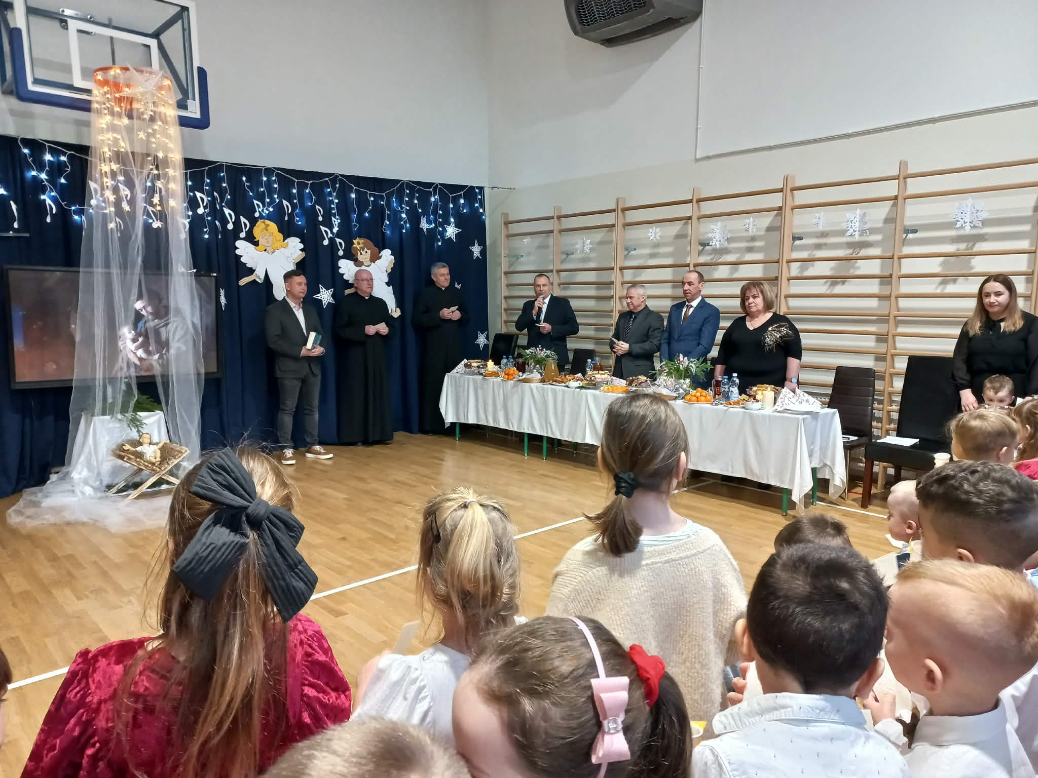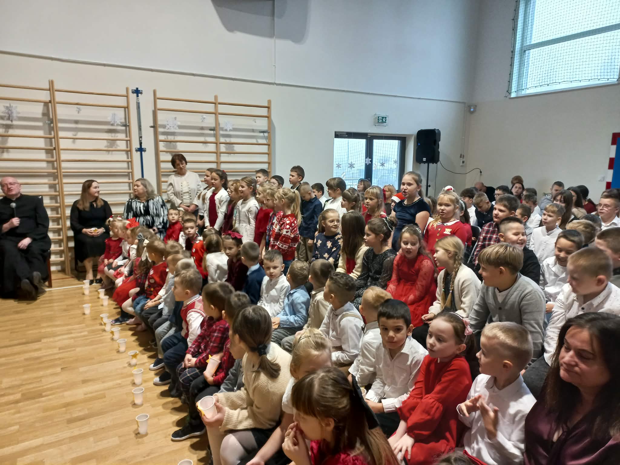 Centralnym punktem uroczystości było wspólne kolędowanie, w które zaangażowali się uczniowie wszystkich klas. Dzieci i młodzież z radością wykonywały tradycyjne polskie kolędy i pastorałki, tworząc niezwykle nastrojową i wzruszającą atmosferę. Wspólny śpiew stał się symbolem jedności, radości oraz pielęgnowania bożonarodzeniowych tradycji.
