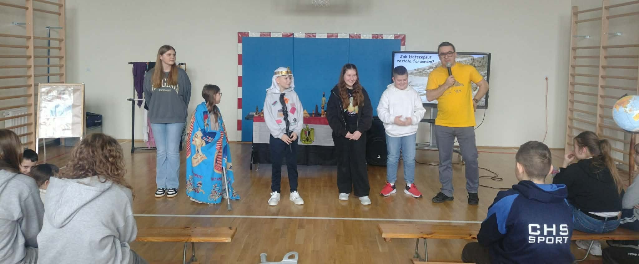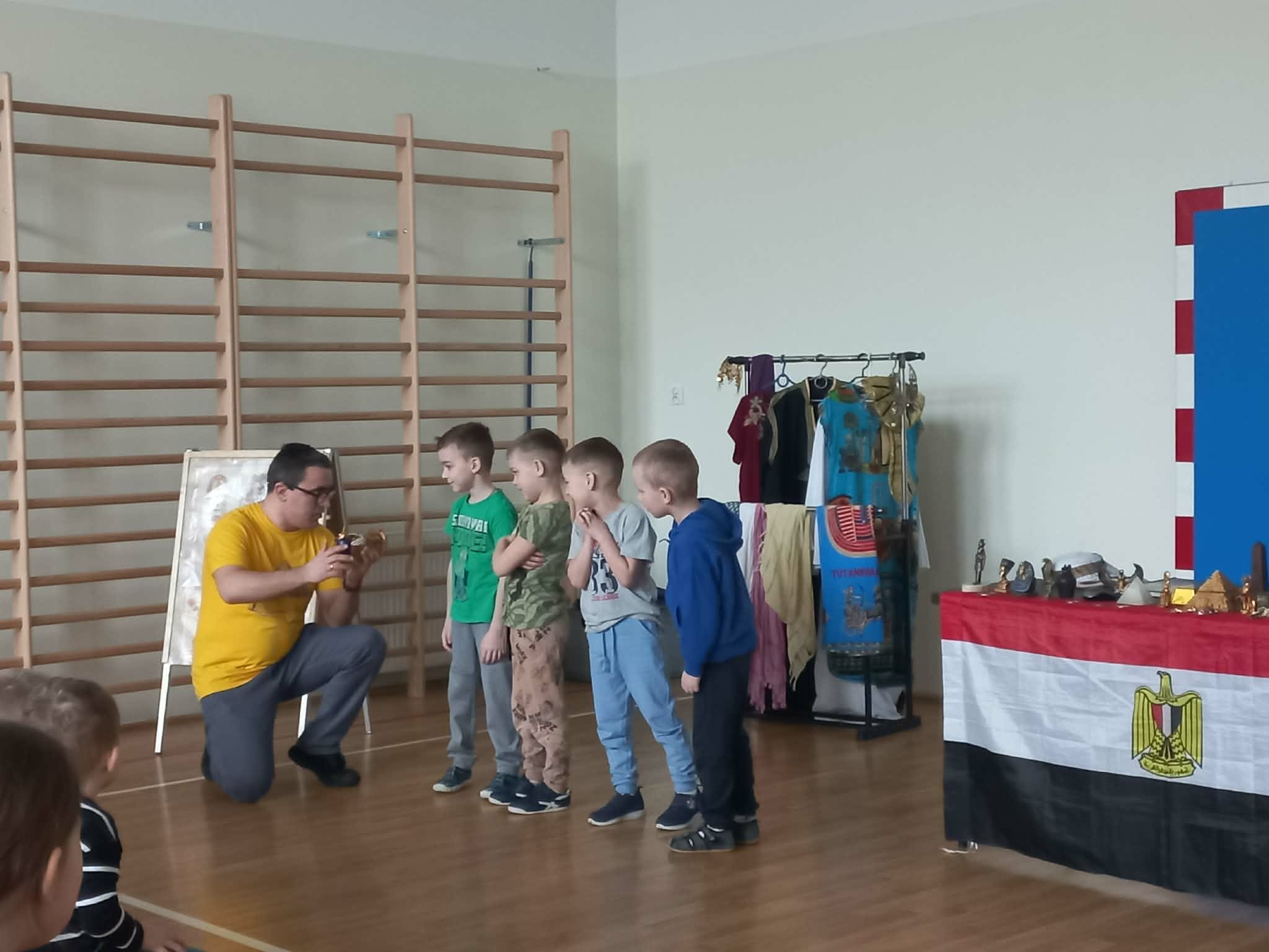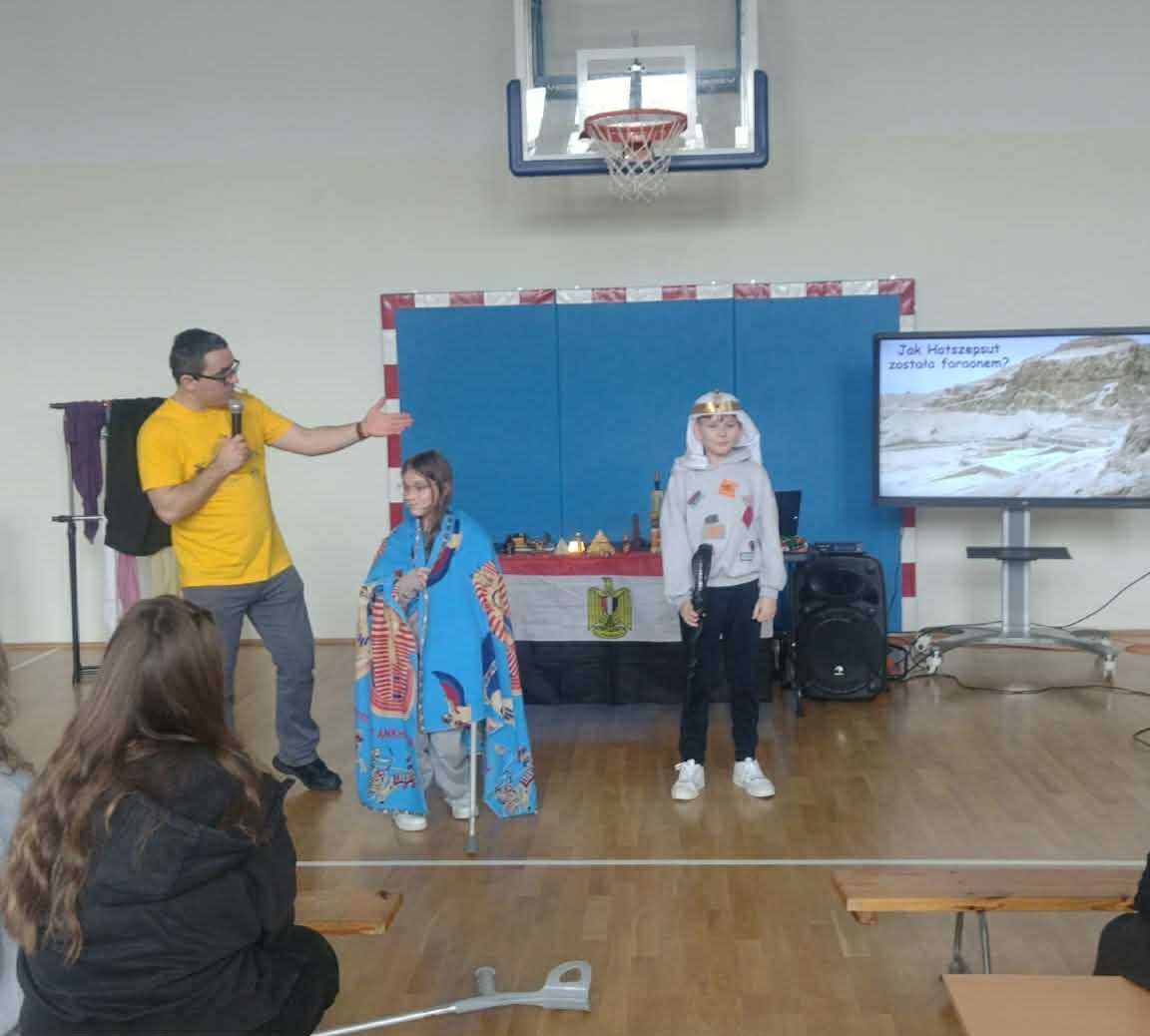 Najwięcej emocji wzbudziła część interaktywna, w której pan Mateusz angażował dzieci do wspólnej zabawy i odgrywania ról. Niektórzy uczniowie mogli wcielić się w postacie faraonów, zakładając przygotowane elementy stroju i poznając symbolikę władzy w starożytnym Egipcie. Dzięki temu dzieci mogły poczuć się jak w prawdziwym starożytnym pałacu nad Nilem. Było dużo śmiechu, ciekawych pytań i wspólnej zabawy.