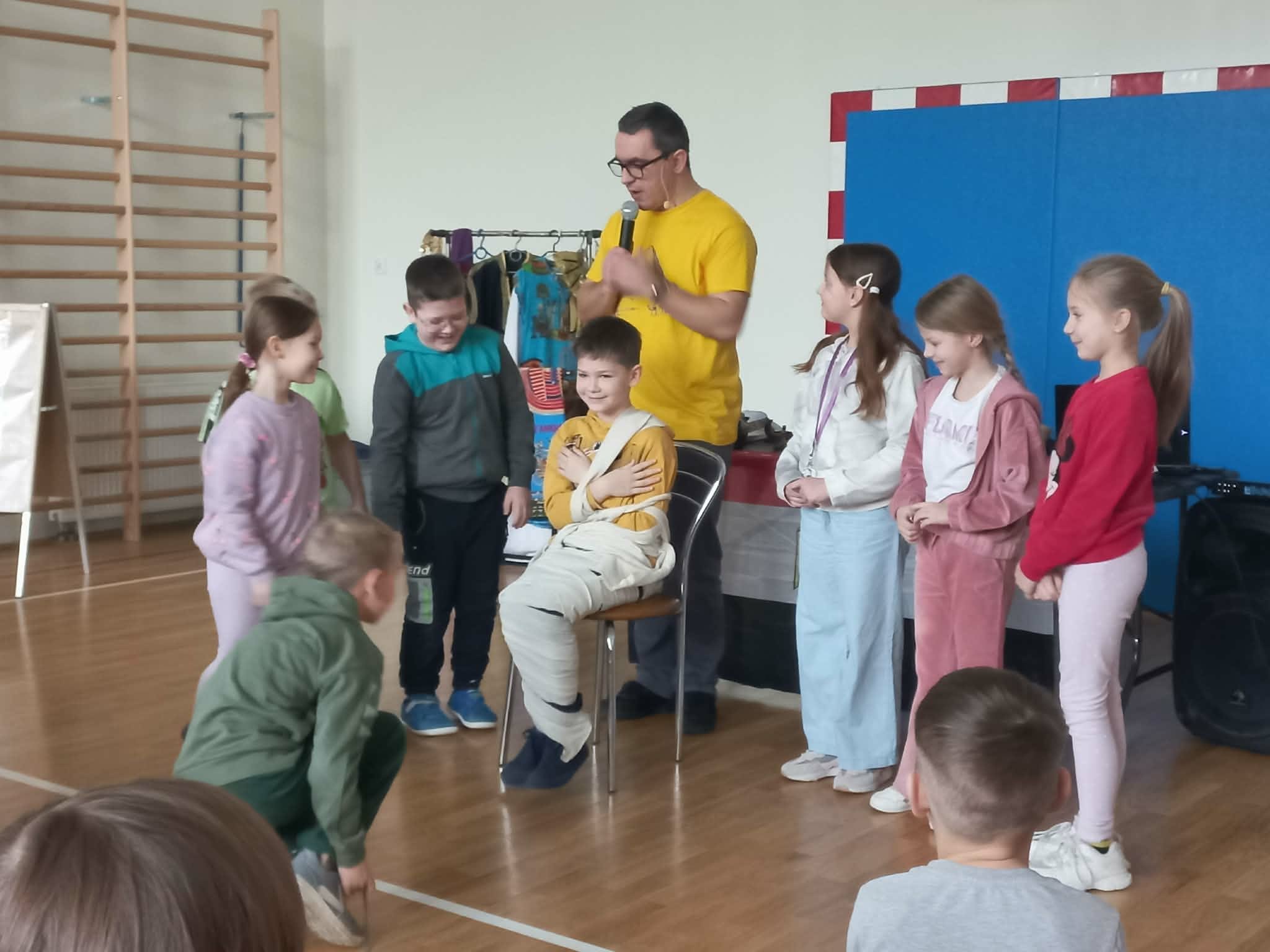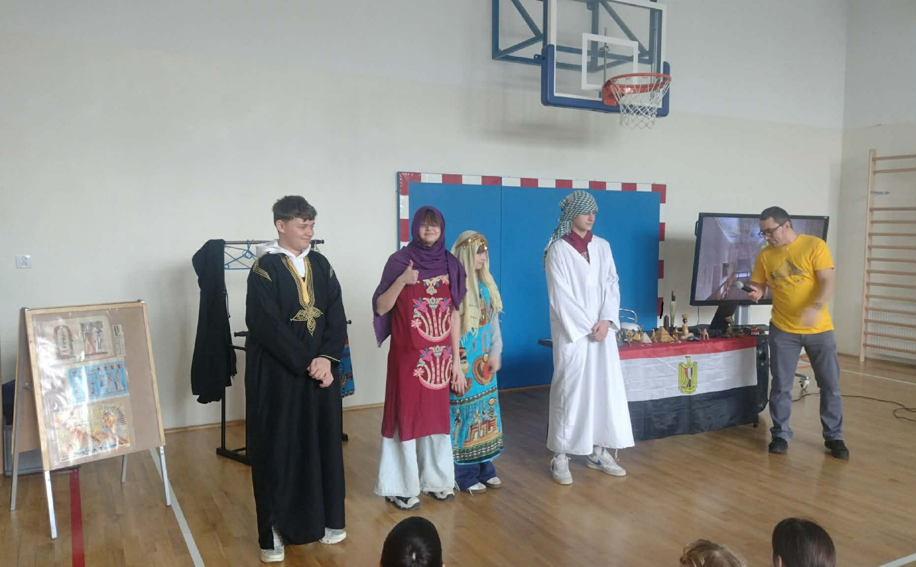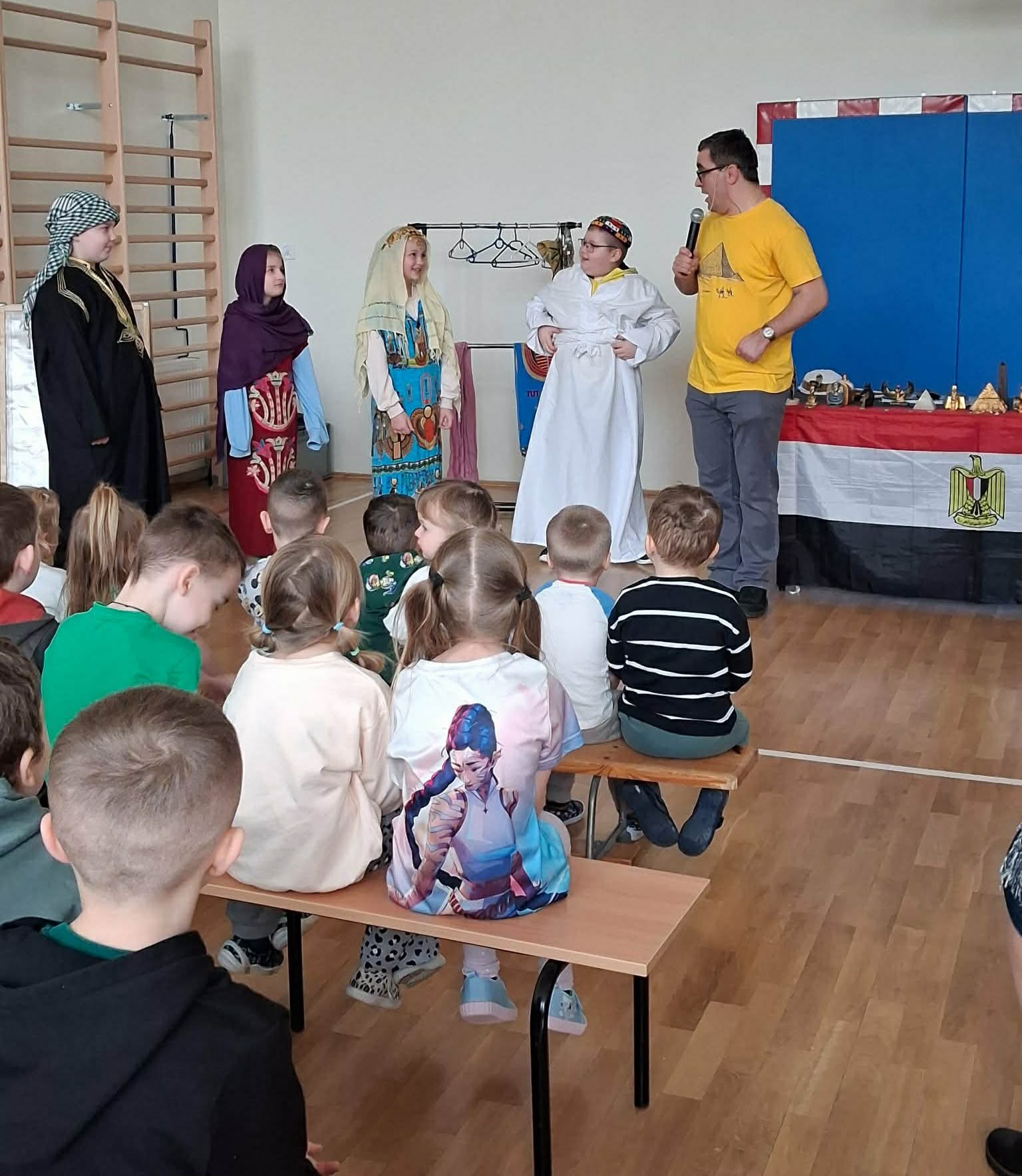 Najwięcej emocji wzbudziła część interaktywna, w której pan Mateusz angażował dzieci do wspólnej zabawy i odgrywania ról. Niektórzy uczniowie mogli wcielić się w postacie faraonów, zakładając przygotowane elementy stroju i poznając symbolikę władzy w starożytnym Egipcie. Dzięki temu dzieci mogły poczuć się jak w prawdziwym starożytnym pałacu nad Nilem. Było dużo śmiechu, ciekawych pytań i wspólnej zabawy.