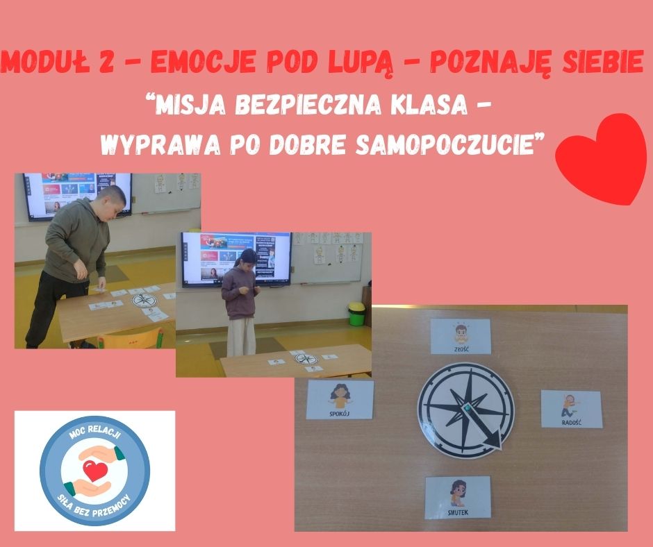 Kolejną aktywnością był Kompas emocji, polegający na dopasowywaniu emocji do przedstawionych sytuacji. Uczniowie analizowali krótkie scenki i wskazywali emocję, która mogłaby im towarzyszyć, rozwijając empatię i umiejętność interpretowania zachowań innych.
