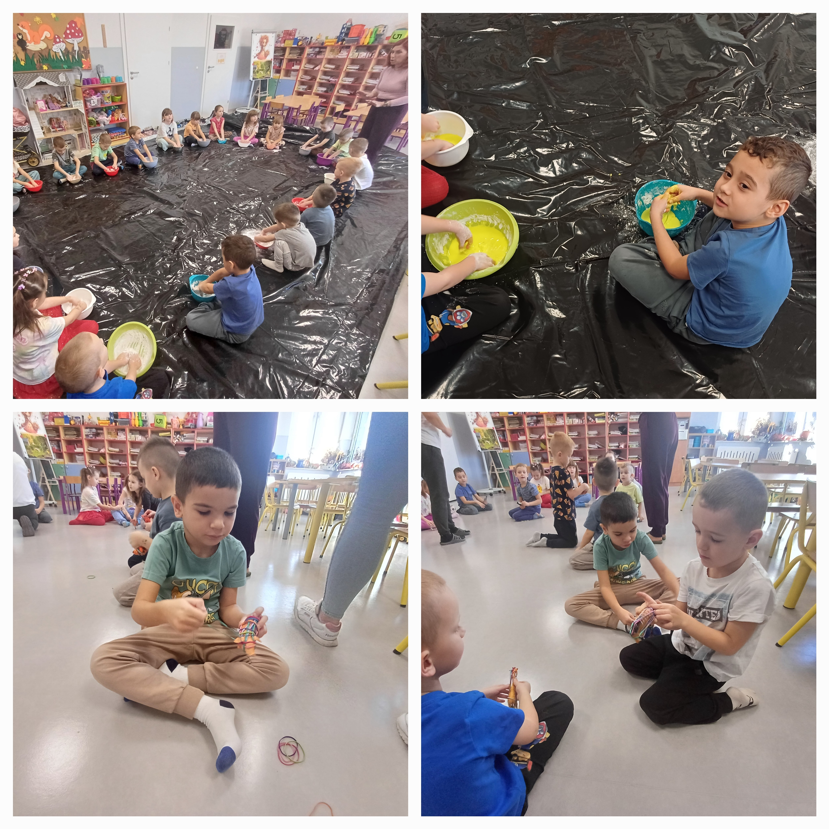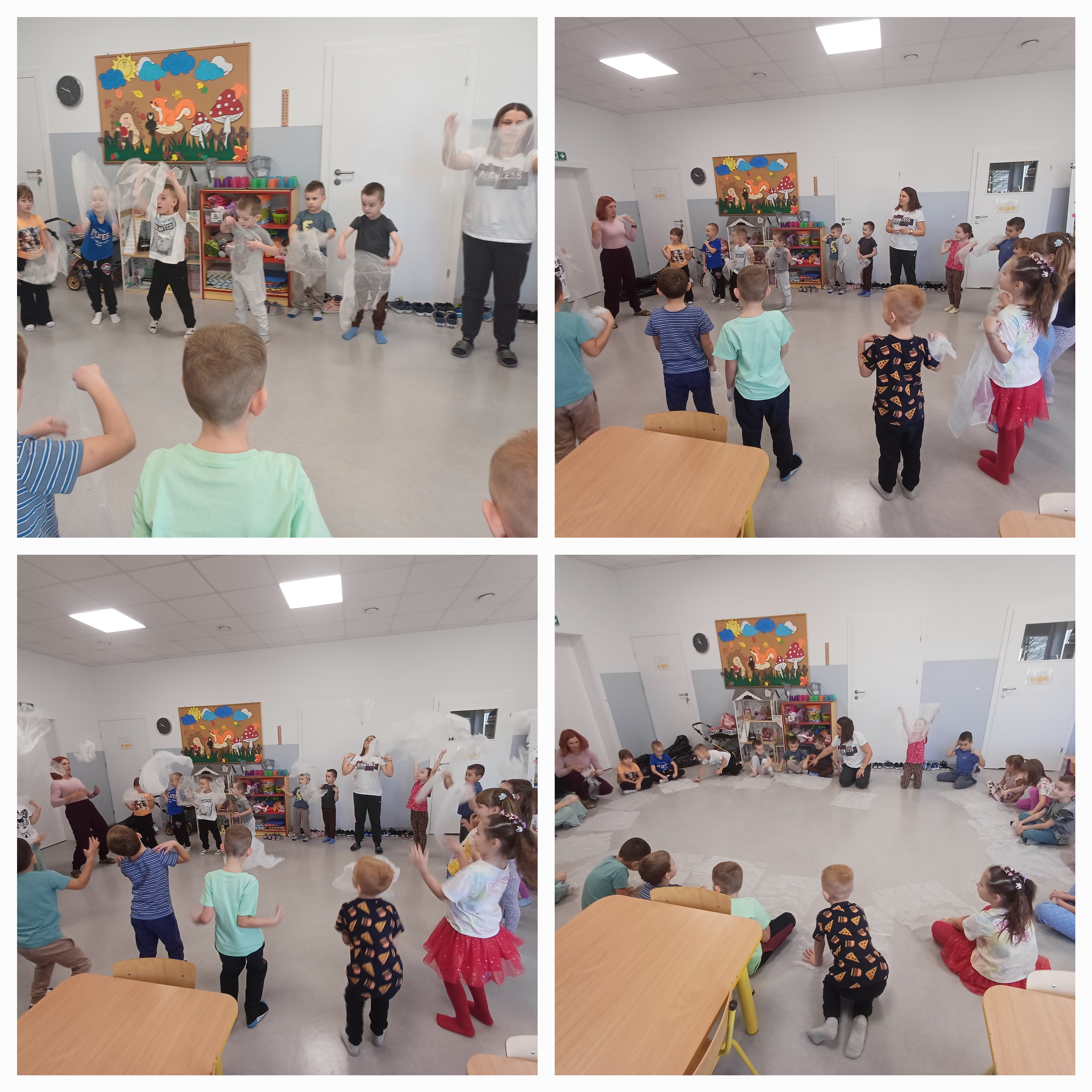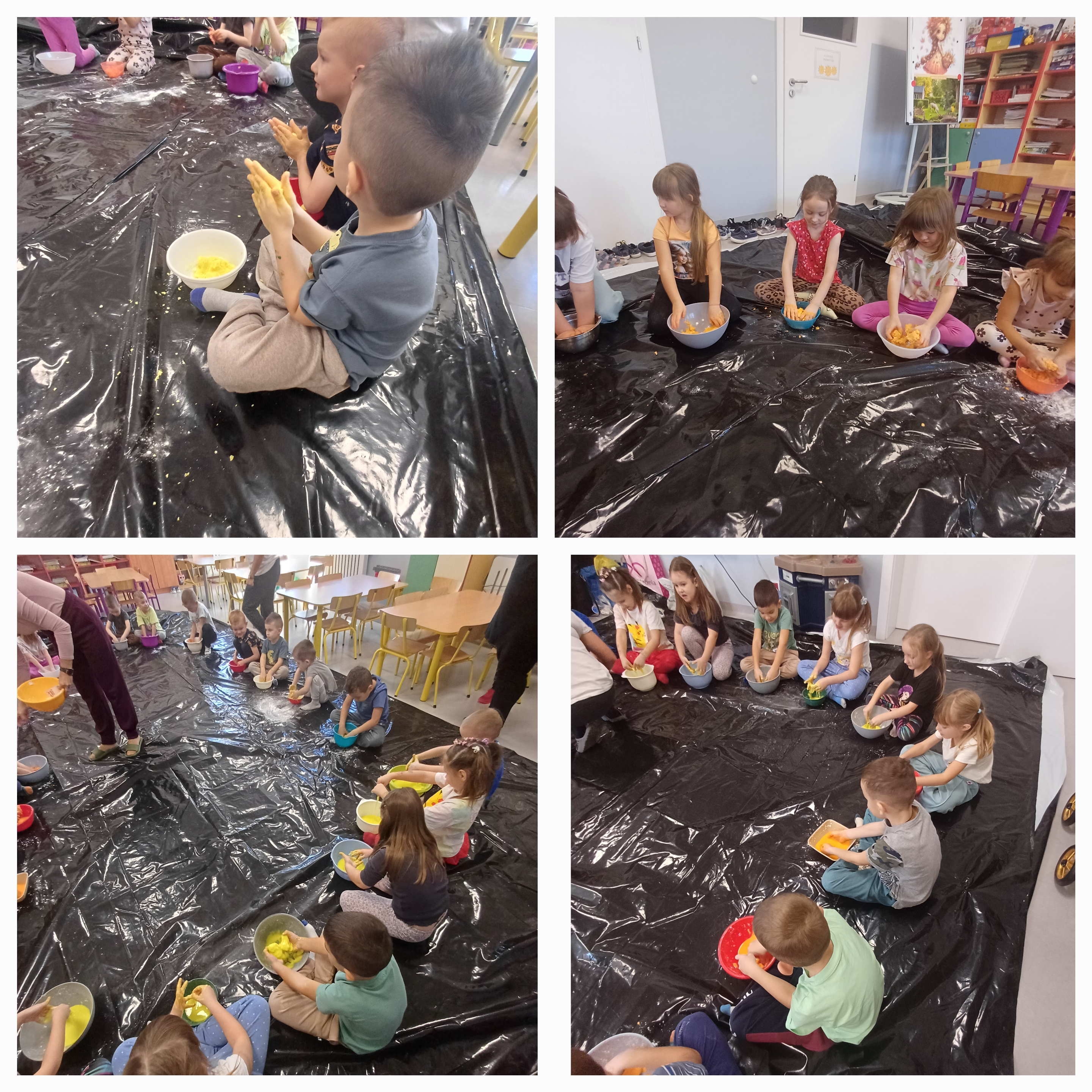 W dniu 21 października odbyły się zajecia z Sensoplastyki prowadzone przez p. Iwonę Radomyską i p. Dorotę Jezierską z Poradni Psychologiczno-Pedagogicznej w Stoku Lackim. Celem zajęć była stymulacja zmysłów naszych przedszkolaków poprzez swobodną, kreatywną zabawę z różnorodnymi materiałami i teksturami. W trakcie zajęć dzieci wykonały wiele ćwiczeń sensoryczno-ruchowych. Na koniec przygotowały plastyczną, kolorową masę z mąki i oleju, którą zabrały do domu. Przedpołudnie upłynęło nam bardzo aktywnie, bawiliśmy się doskonale!