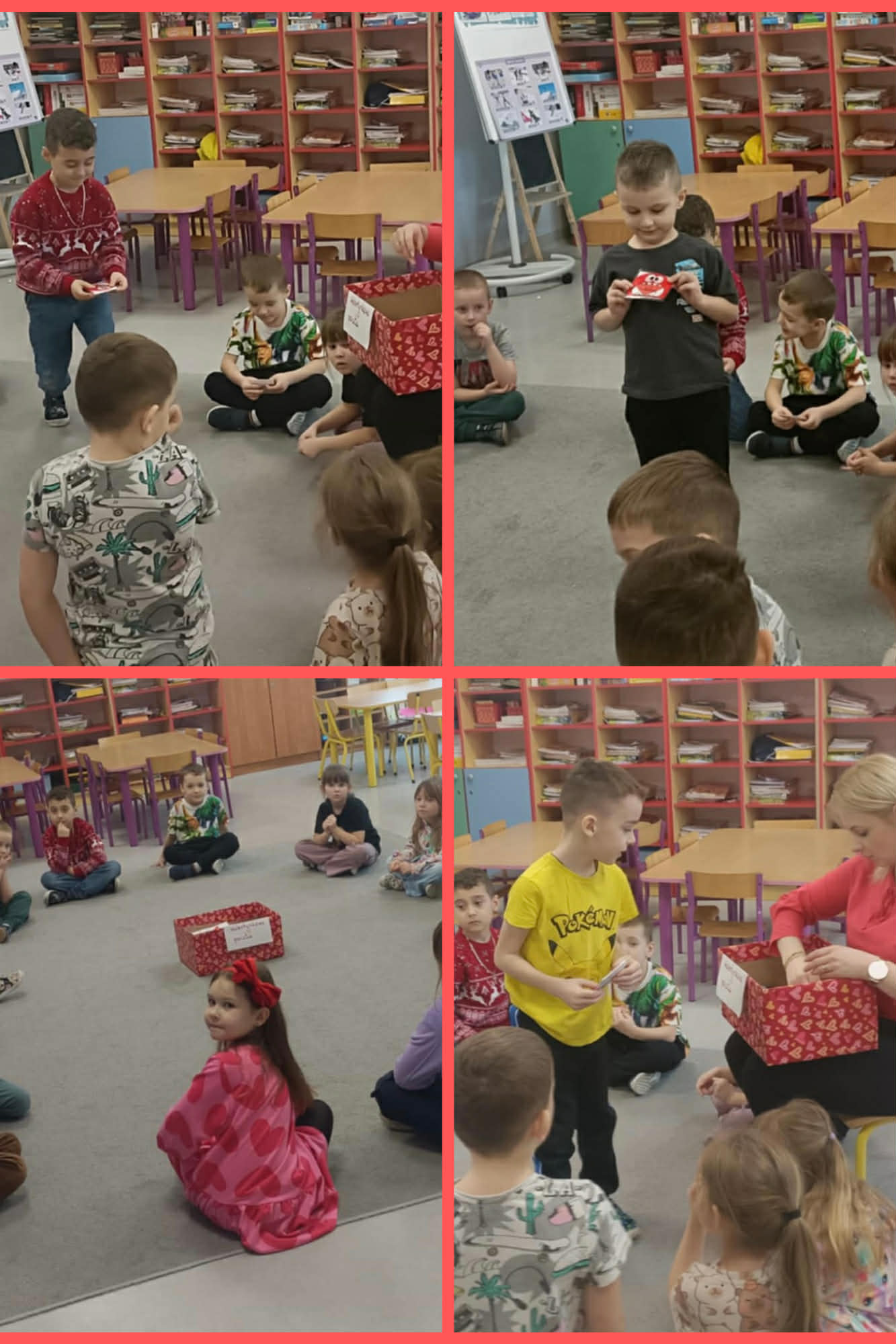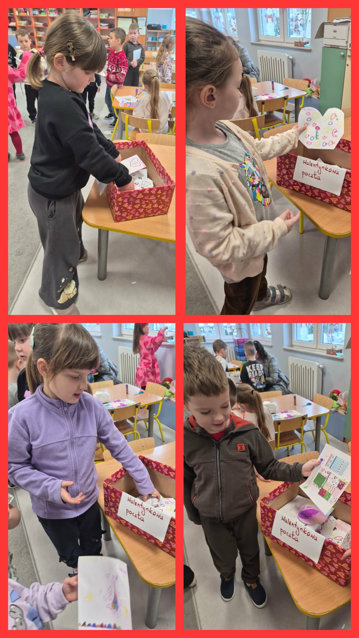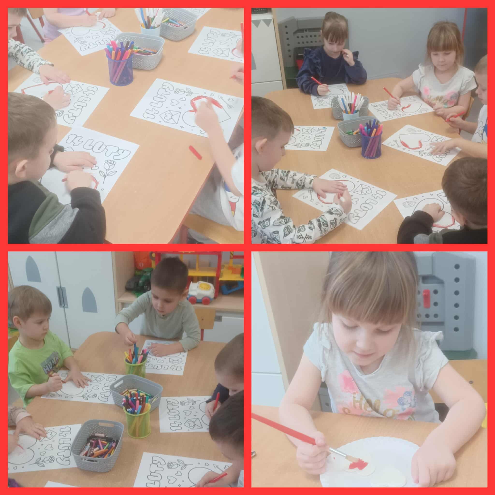 Przedszkolaki samodzielnie wykonywały swoje kartki walentynki, wykazując się ogromną kreatywnością. Powstały piękne, kolorowe kartki ozdobione serduszkami, naklejkami, brokatem oraz ciepłymi życzeniami. Każda praca była wyjątkowa i wykonana z wielkim zaangażowaniem. Tak przygotowane walentynki dzieci wrzucały do specjalnie przygotowanej skrzynki walentynkowej.
