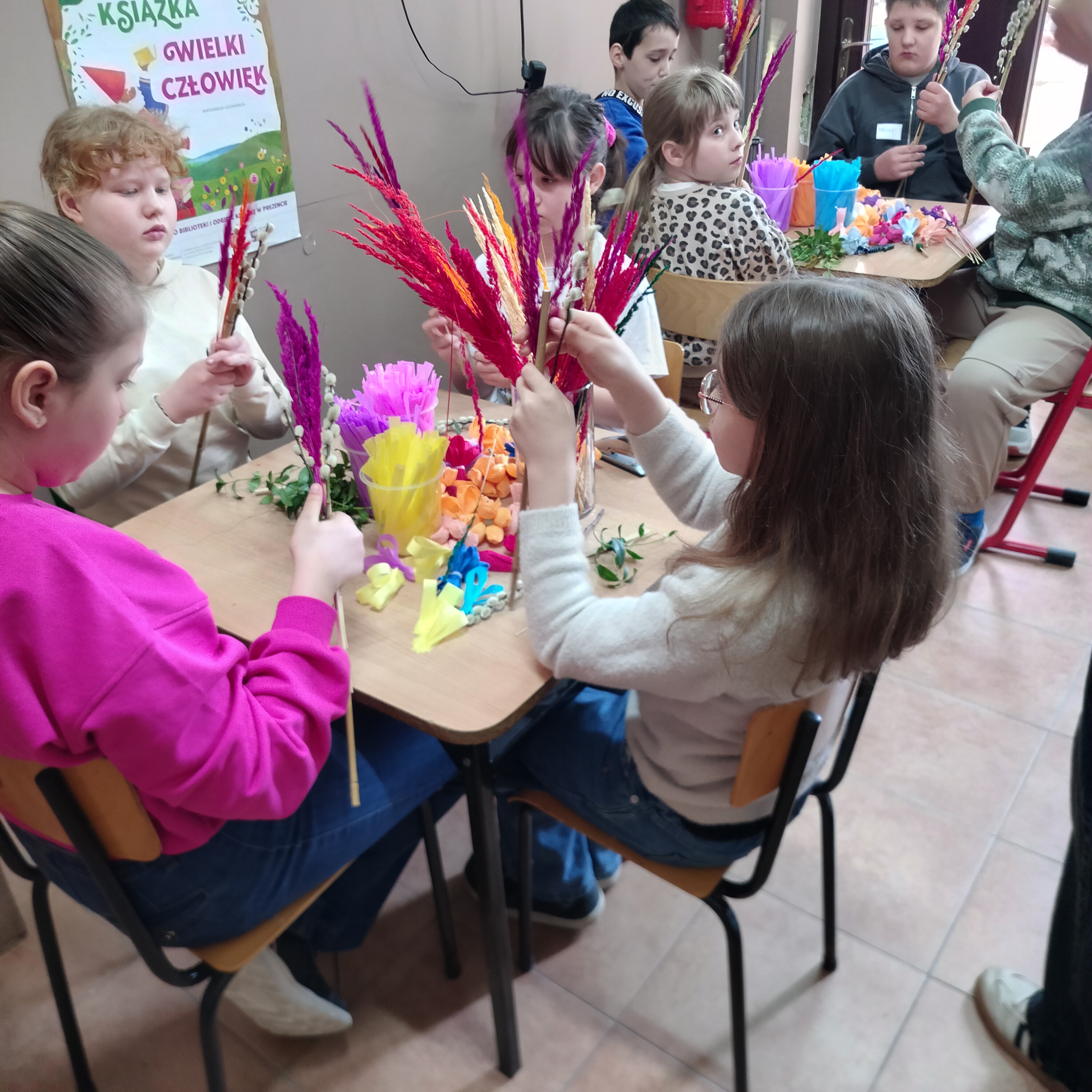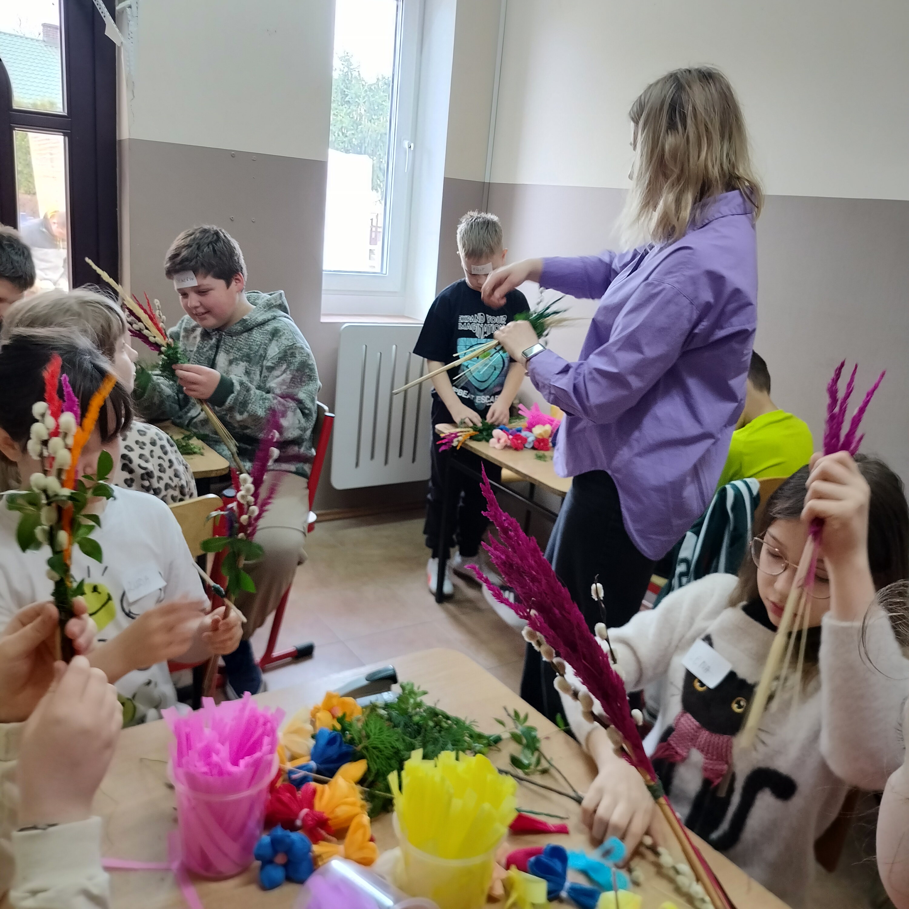 Podczas warsztatów uczniowie samodzielnie, ale pod czujnym okiem zaproszonego gościa Pani Karoliny Stańskiej wykonywali kolorowe palmy z wykorzystaniem różnorodnych materiałów. Każda praca była niepowtarzalna i odzwierciedlała zaangażowanie uczestników. Warsztaty przebiegały w radosnej i twórczej atmosferze.