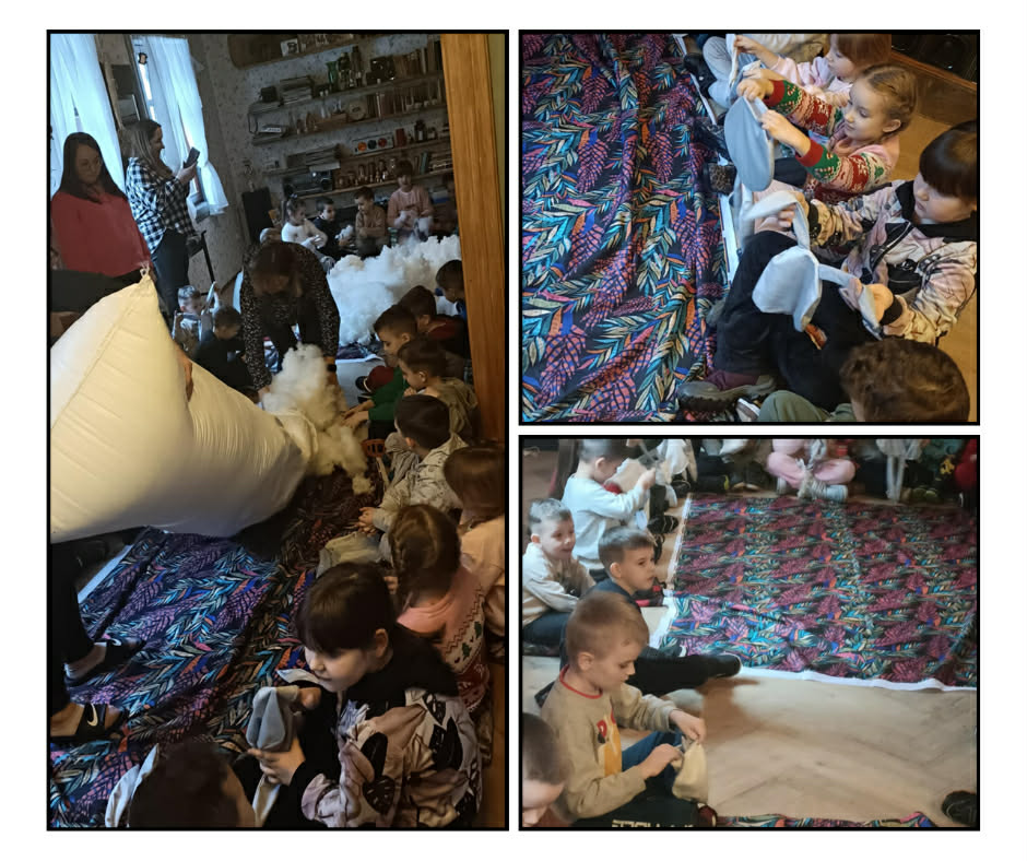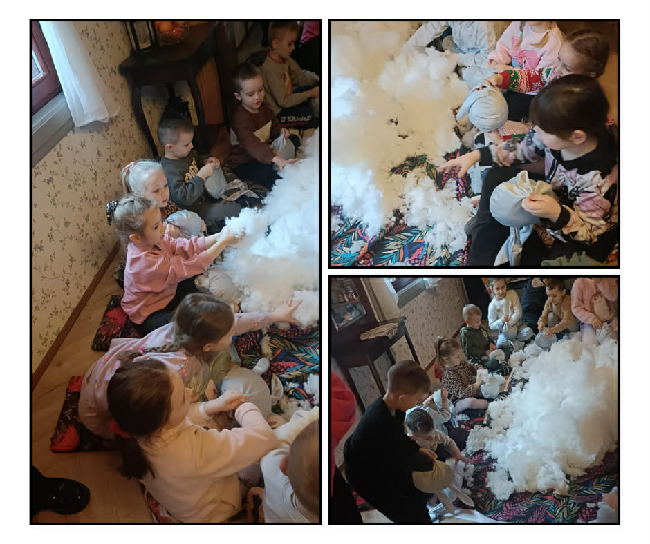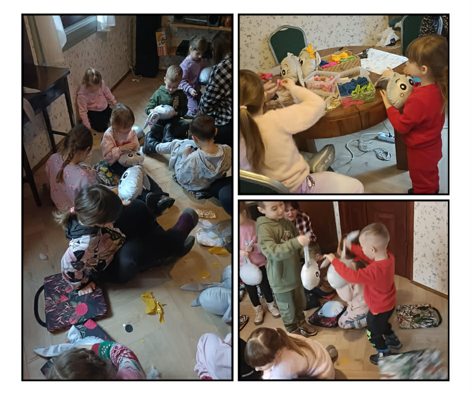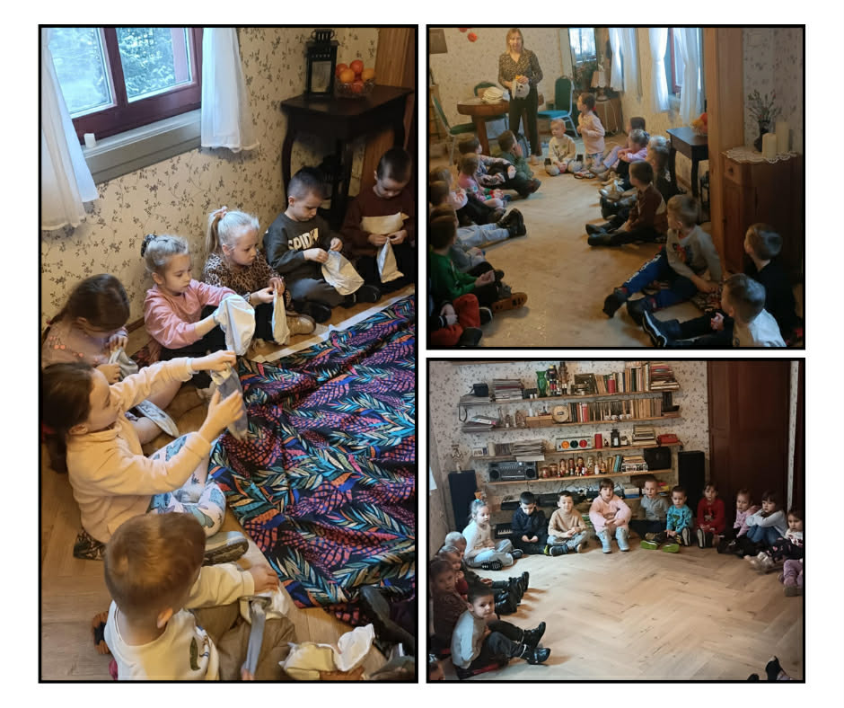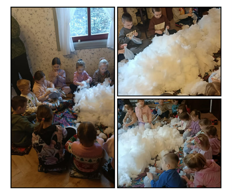 Następnie udały się do rustykalnej chaty SielAnki, gdzie odbyły się miękkie warsztaty dla dzieci. Pod czujnym okiem pań prowadzących przedszkolaki własnoręcznie wykonywały pluszowe zajączki. Z ogromnym zaangażowaniem przyklejały oczy, noski i kokardki oraz ozdabiały swoje maskotki. Każdy zając był wyjątkowy i niepowtarzalny! Na zakończenie warsztatów dzieci obejrzały bajki wyświetlane na projektorze.