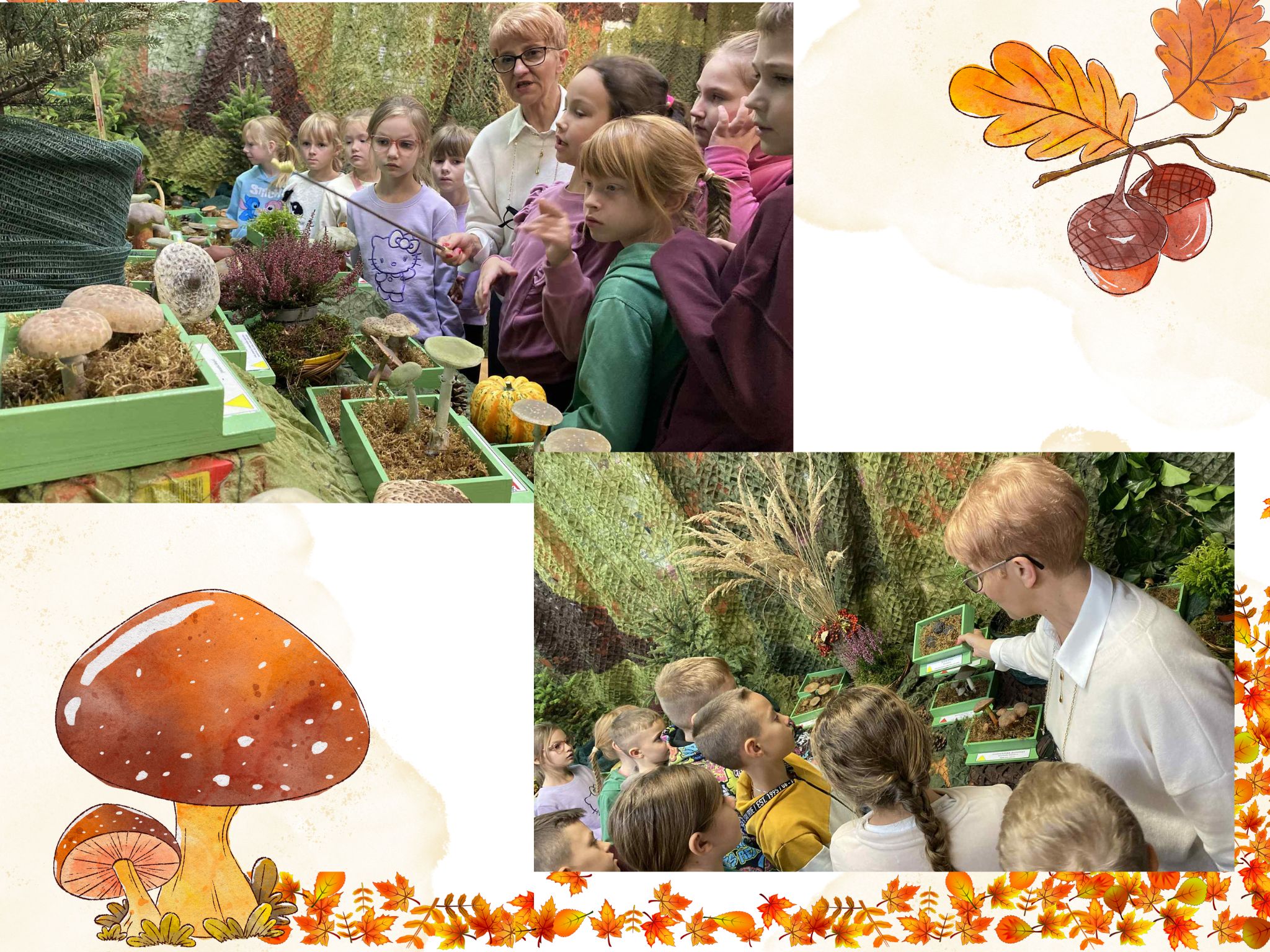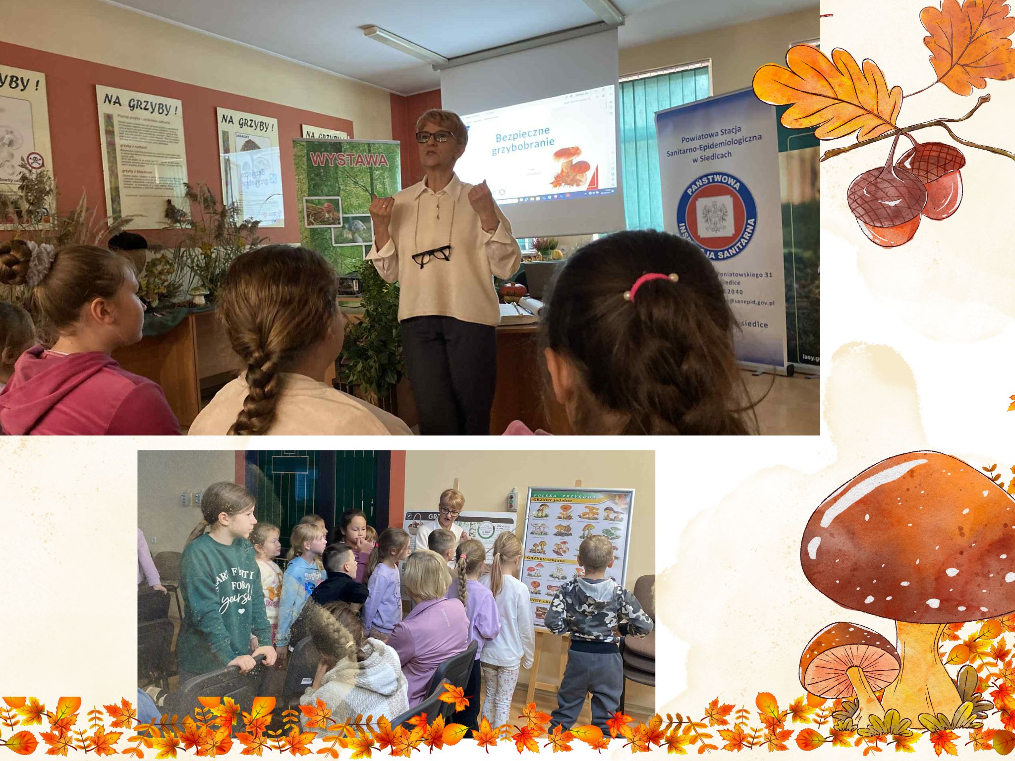 W środę 29.10.2025 r. uczniowie z klasy 2 i 3 wybrali się na wycieczkę edukacyjną. Nasza wyprawa rozpoczeła się od wyjątkowej wystawy pt. Poznaj Grzyby - unikniesz Zatrucia, którą zorganizowała Powiatowa Stacja Sanitaro-Epidemiologiczna w Siedlcach. Wystawa miała na celu edukację na temat grzybów jadalnych, niejadalnych i trujących oraz promowanie bezpiecznych zachowań podczas grzybobrania. Z wielkim zainteresowaniem podziwialiśmy modele grzybów oraz słuchaliśmy wielu niesamowitych ciekawostek na ich temat (Czy wiecie, że psy są wykorzystywane do poszukiwania trufli? Ich doskonały węch pozwala na zlokalizowanie tych rzadkich grzybów rosnących pod ziemią!). Otrzymaliśmy również ważne wskazówki na temat miejsc występowania kleszczy i zagrożeń związanych z ugryzieniem przez te pajęczaki, sposobów ich przenoszenia się na zwierzęta i ludzi oraz informacje dotyczące zapobiegania atakom kleszczy i ochronę przed przenoszonymi przez nie chorobami. Wystawa była doskonałą okazją do nauki poprzez doświadczenie i obserwację. Zdobyte cenne informacje z pewnością przydadzą się w przyszłości - szczególnie podczas jesiennych spacerów po lesie. Dziękujemy pracownikom PSSE za przeprowadzenie ciekawej lekcji przyrody. Po zajęciach z grzybobrania udaliśmy się na przerwę obiadową. Wspólny posiłek w przyjemnym otoczeniu był świetną okazją do utrwalenia i zacisnięcia naszych szkolnych więzi. Pokrzepieni pysznym jedzeniem, pełni siły i energii udaliśmy się na wyczekiwane atrakcje do Parku Wodnego. Wycieczka na basen to świetny sposób na aktywność fizyczną, relaks i zabawę. Wróciliśmy zmęczeni, ale zadowoleni, pragnąc podzielić się z naszymi bliskimi niezapomnianymi wrażeniami i wspaniale spędzonym czasem. Już nie możemy doczekać się kolejnej eskapady !