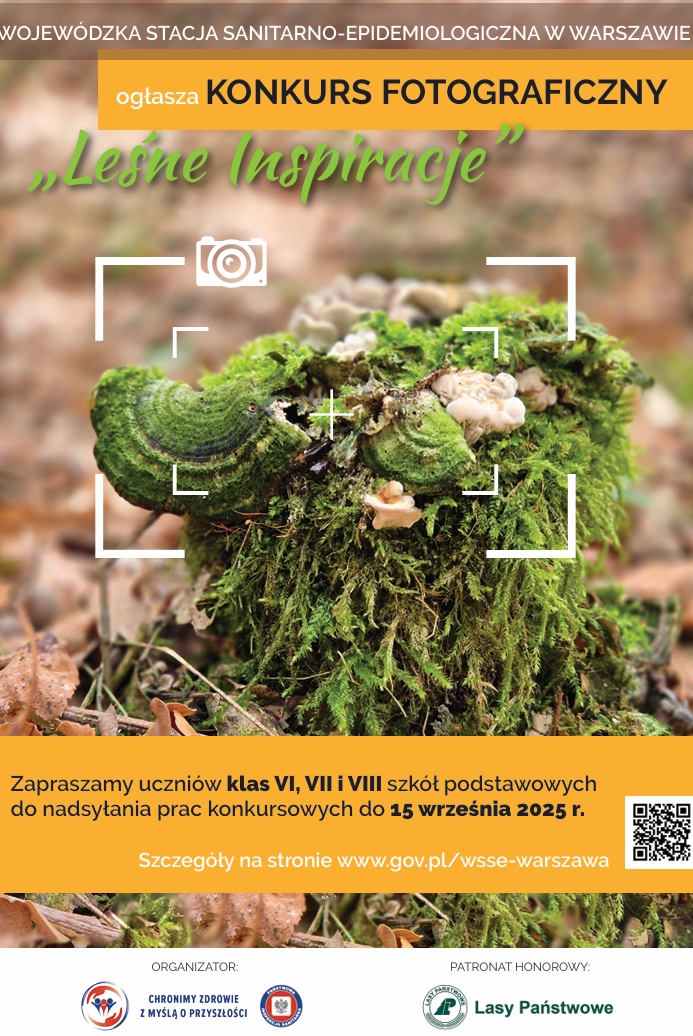 Zapraszamy do udziału w XII edycji Wojewódzkiego Konkursu Fotograficznego pt. Leśne Inspiracje. Adresatami konkursu są uczniowie mazowieckich szkół podstawowych z klas VI, VII i VIII w roku szkolnym 2025/2026. Wojewódzka Stacja Sanitarno-Epidemiologiczna w Warszawie już po raz dwunasty serdecznie zaprasza uczniów szkół podstawowych z klas VI, VII i VIII z terenu województwa mazowieckiego do udziału w Konkursie Fotograficznym pt. Leśne Inspiracje. Tematem przewodnim zmagań uczestników jest ukazanie piękna lasu i runa leśnego poprzez fotografie grzyba/grzybów w ich naturalnym środowisku. Konkurs od lat cieszy się popularnością wśród młodych amatorów fotografii przyrody. Nadsyłane fotografie urzekają pomysłowością